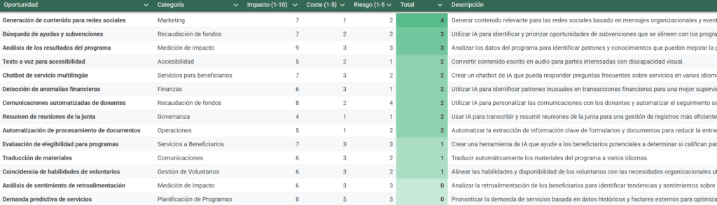 - Identificación de oportunidades: lluvia de ideas e identificación de posibles casos de uso de IA que se alineen con la misión y los objetivos estratégicos de la organización.